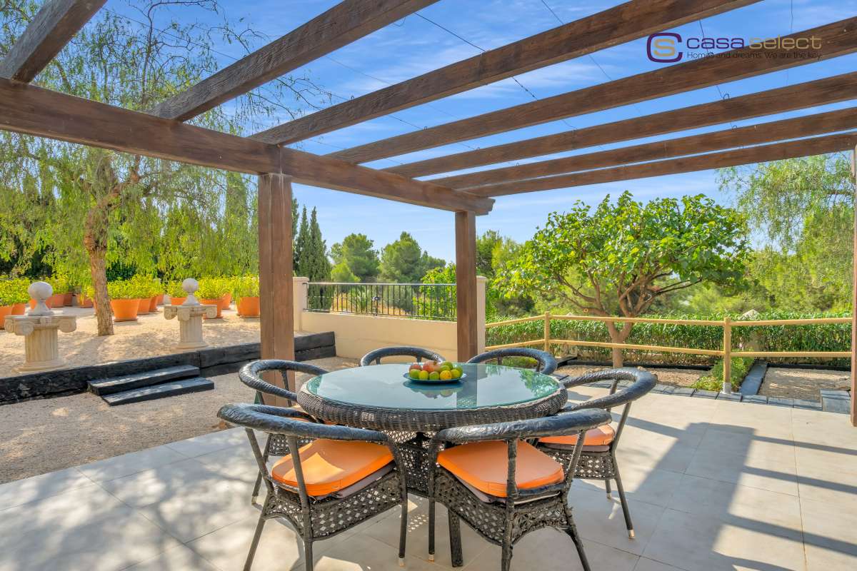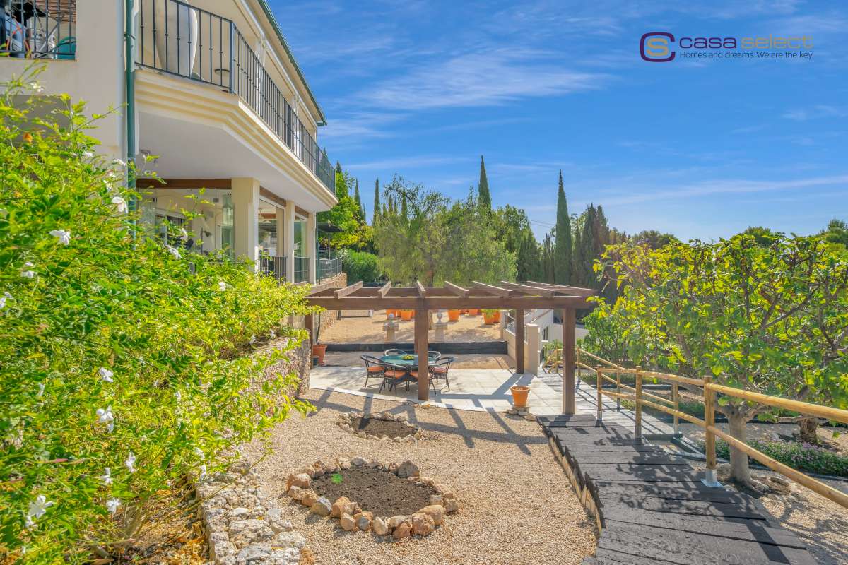 The exterior is a true Mediterranean oasis, featuring a private pool surrounded by sun-drenched terraces, a pergola-covered lounge area, and a vibrant multi-level tropical garden with fruit trees and colourful vegetation including a lounge garden area, perfect for coffee with friends or family. At the lower end of the plot, you will also find a double garage, a machine room, and a service toilet.