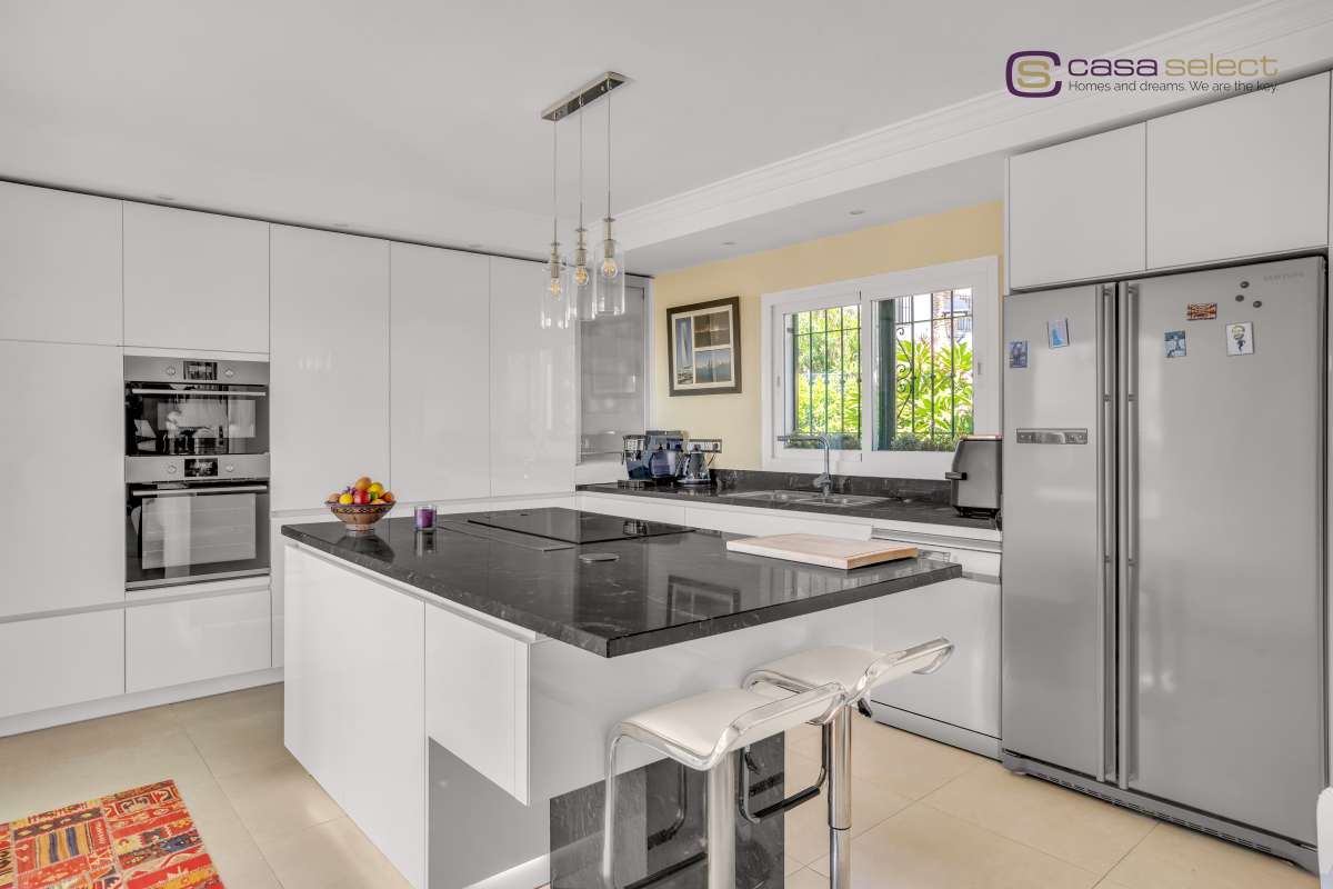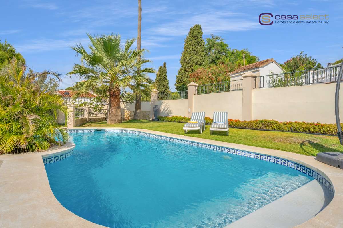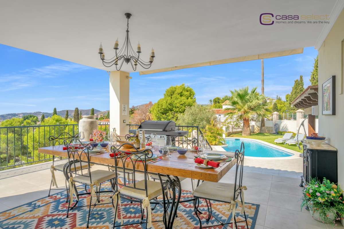 Thanks to its south-facing orientation, the villa is bathed in natural light and sunshine throughout the day, taking full advantage of the more than 300 days of sun the Costa del Sol has to offer. Multiple spacious terraces, a lush tropical garden, and a private swimming pool provide idyllic settings for relaxation and entertainment alike. Additional highlights include a covered outdoor dining area with barbecue, a private gym, parking for several vehicles with a carport, and a closed double garage with automatic doors.