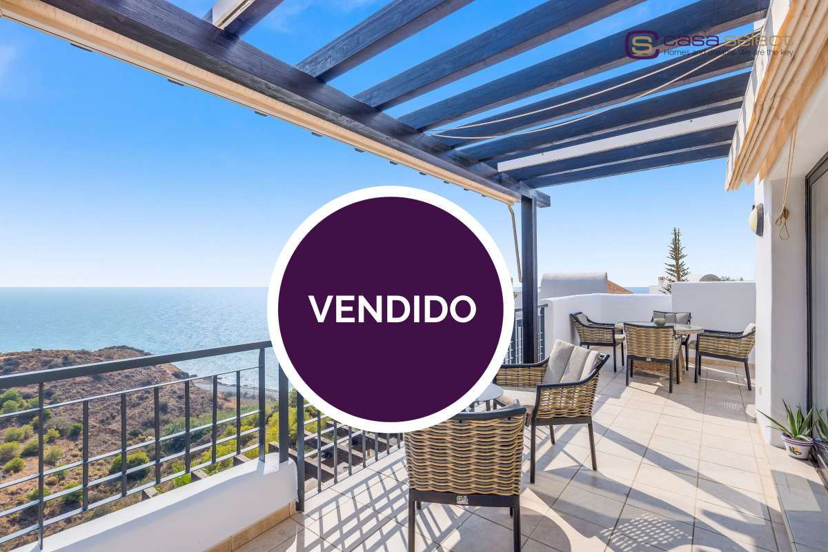 This penthouse is located in Vistamar, an exclusive development situated in the sought after area of Calaceite, along the coastal road connecting Nerja and Torrox Costa. The complex has been designed so that all apartments enjoy stunning sea views, creating an ideal setting for those seeking luxury and tranquillity. In addition, the development offers two communal swimming pools with sea views surrounded by well maintained gardens, providing the perfect setting to relax. One of the highlights of this property is its large terrace equipped with pergola, facing east and south, guaranteeing sun from early morning until late afternoon. From here, you can enjoy panoramic views, stretching from the mountains to the Mediterranean Sea, with Nerja in the distance. The interior of the penthouse is bright, especially in the living room with double height ceiling, that connects through sliding windows to the terrace. The kitchen is fully equipped with electric appliances. The apartment has two double bedrooms, both with fitted wardrobes and 2 bathrooms. The master bedroom has an en suite bathroom with bathtub and direct access to the terrace, while the second bathroom is perfect for guests or family use. It includes a parking space and storage room in the same building with lift, which adds comfort and security. In addition, the property is equipped with hot/cold air conditioning to ensure maximum comfort all year round. With great rental potential, this property also represents a fantastic investment opportunity. The furniture is included in the price, making this property ready to move into or start generating income. EXCLUSIVE WITH CASA SELECT!!